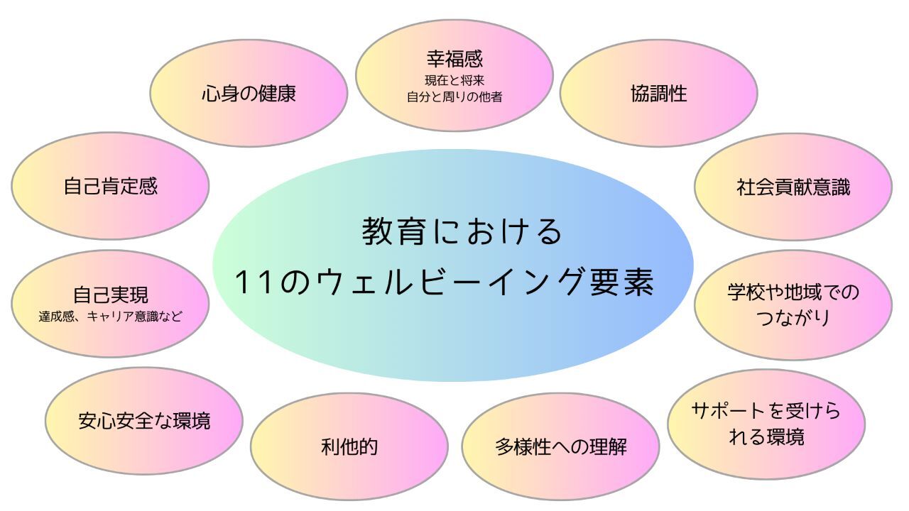 令和5年文部科学省「次期教育振興基本計画におけるウェルビーイングの検討状況について」の中で、[不登校やいじめ、貧困など、コロナ禍や社会構造の変化を背景として子供たちの抱える困難が多様化・複雑化する中で、一人一人のウェルビーイングの確保により、主体性や創造力を育み、一人一人の自己実現を目指すことで、持続可能な社会の創り手としての基盤となる資質・能力が育成できるほか、地域における学びを通じて人々のつながりやかかわりを作り出し、共感的・協調的な関係性に基づく地域コミュニティの基盤を形成する] とあり、教育活動全体を通じたウェルビーイングの向上と、教育に関する11のウェルビーイング要素が明記されています。