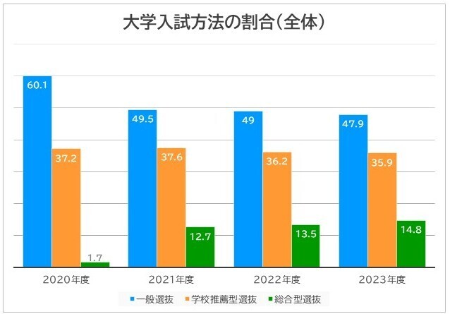 2020年の入試改革以降、年内に合否が分かる推薦入試(別名「年内入試」)の受験者数が一般入試受験者数を上回ってきました。